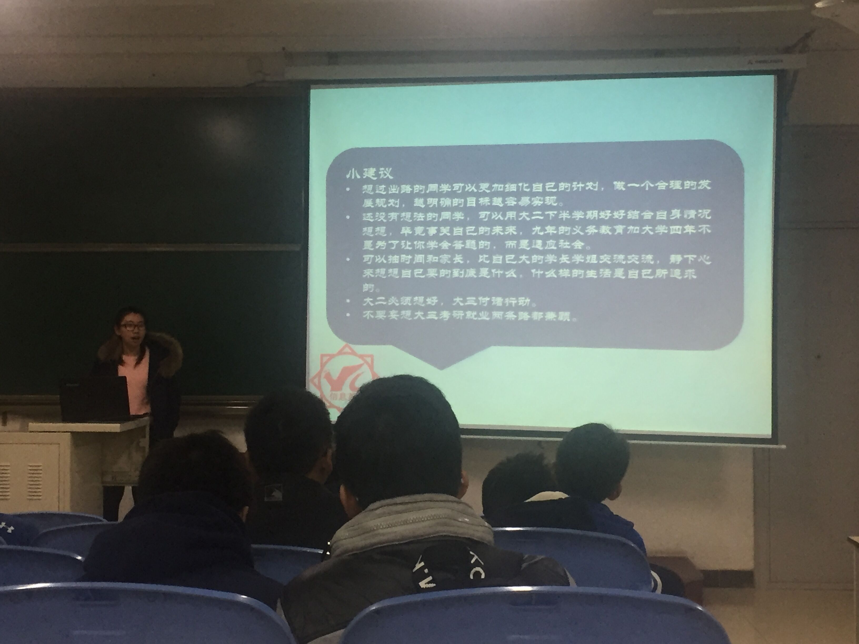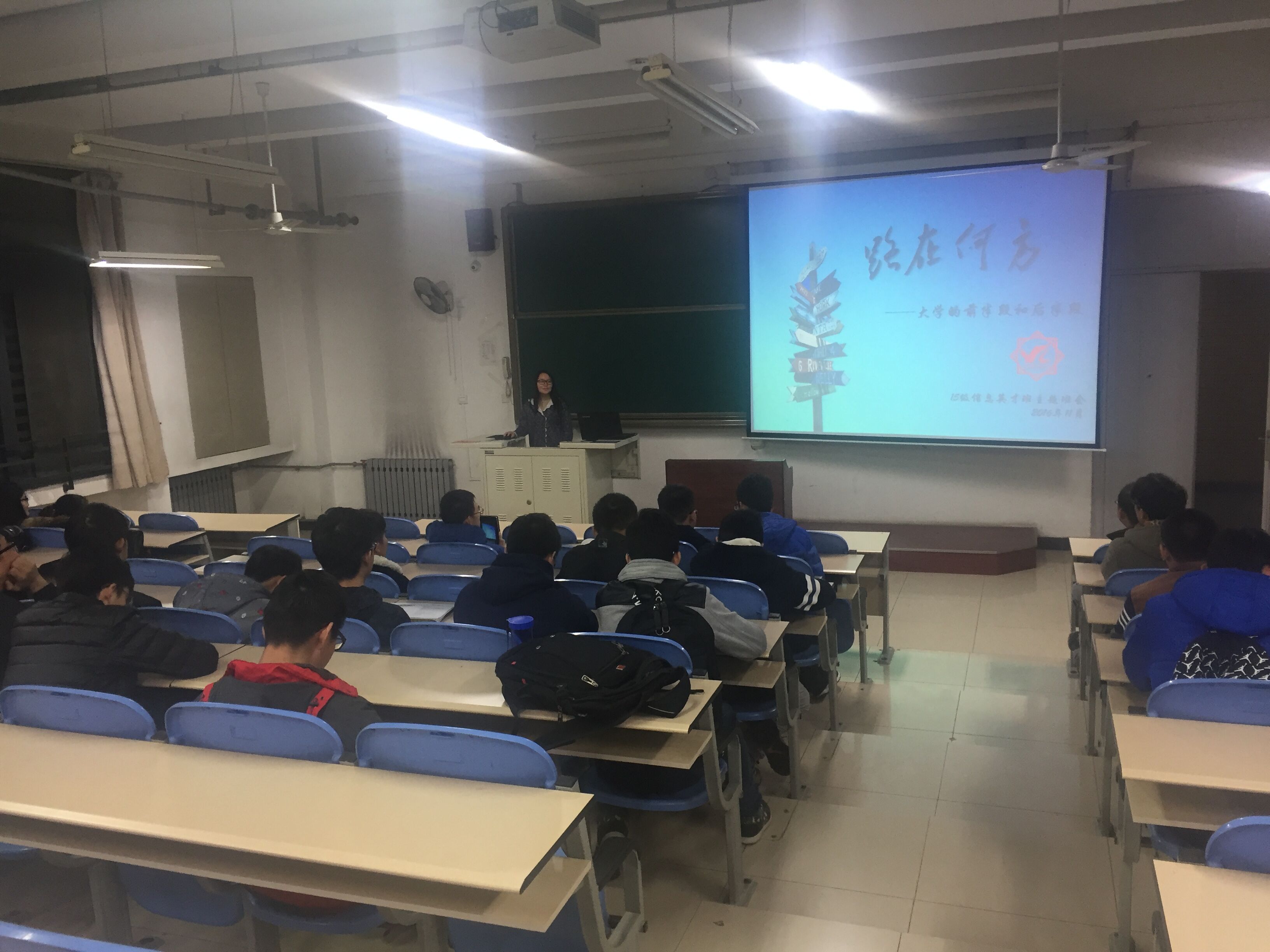 2016年11月27日太阳成集团(tyc1286·China)官方网站2015级信息英才班“路在何方——大学的前半段和后半段”主题班会在B507教室顺利召开。 班主任宁万涛老师出席了本次班会。此次班会的召开主要目的一是对大学前半段生活的回顾二是对所剩大学时光的发展规划,让同学更好的认知自己,确立明确的目标,不虚度光阴。