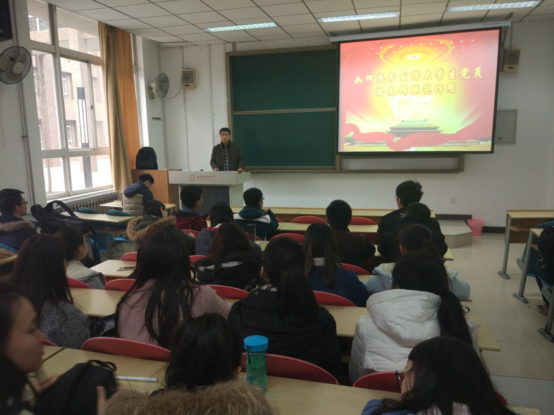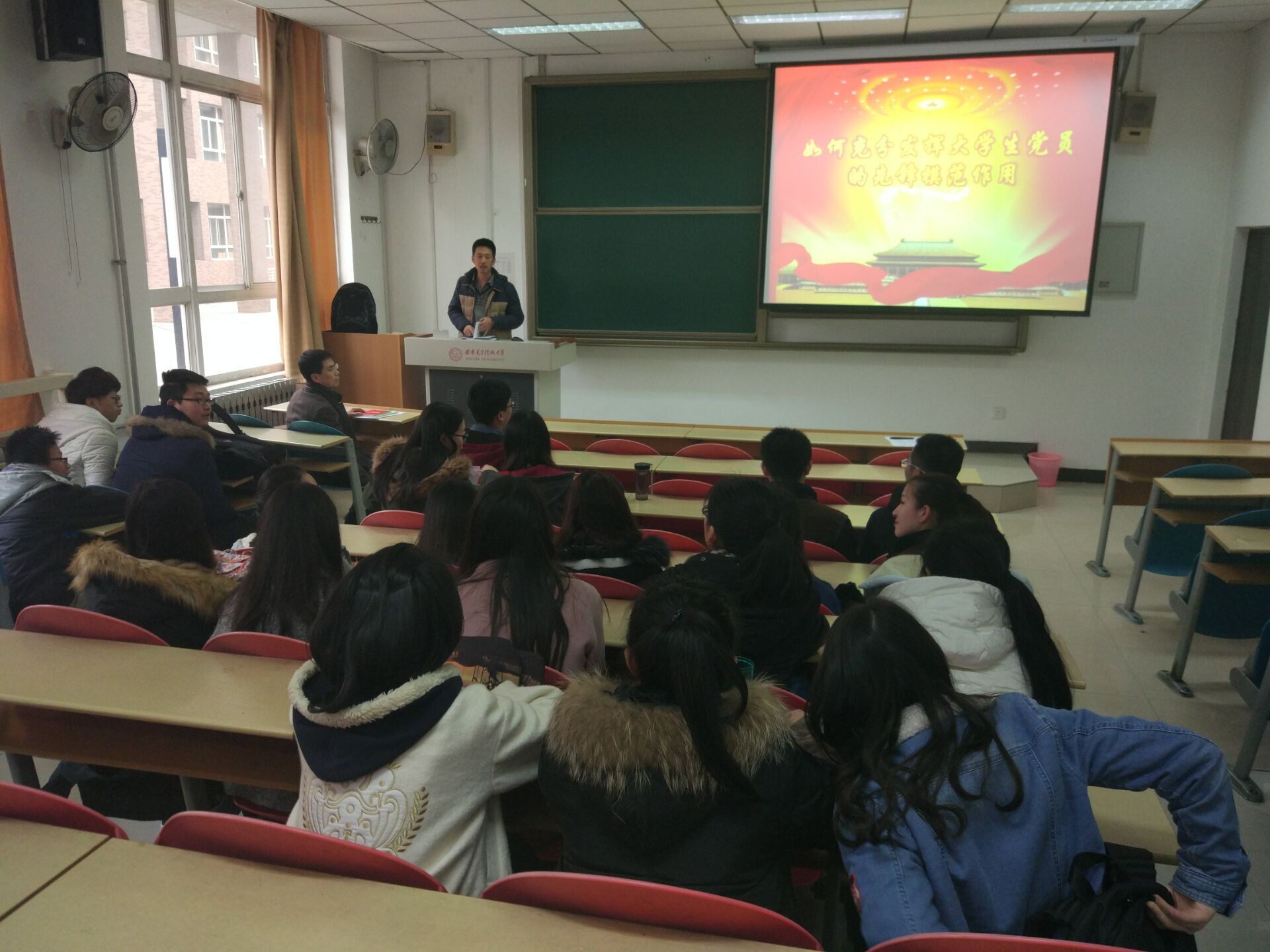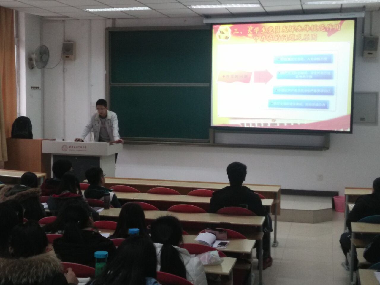 首先,房亮老师给党员同学们讲党课,就十八届六中全会精神和重要意义做了简要介绍;对前期“两学一做”学习教育中的不足进行分析,对新党员的“两学一做”学习教育提出要求。同时讲到党员同学要从各方面严格要求自己,要进一步增强政治意识、大局意识、核心意识和看齐意识,要立足自己是一名新时代大学生的实际,发挥党员的先锋模范作用。然后,支部组织委员万彦然同学带领大家学习党章。最后,大家一起重温长征的革命历史,观看了纪念长征胜利80周年纪录片《铁流两万五千里》。