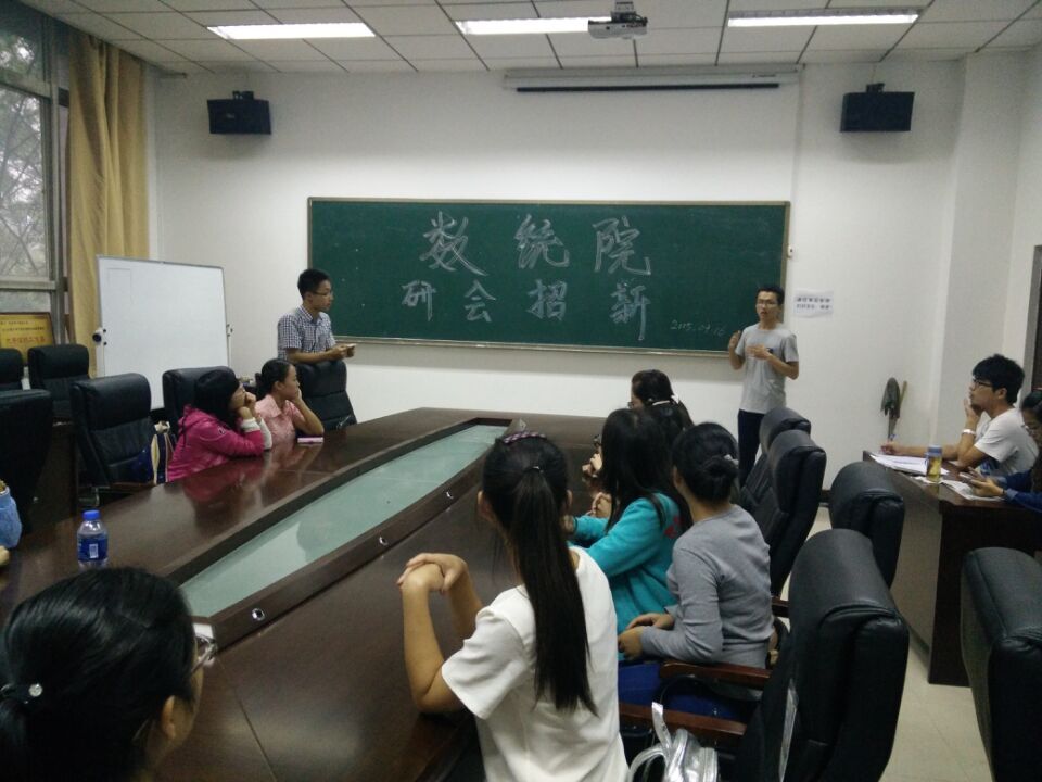 下午六点钟招新工作正式开始,首先由研究生会主席李宾为大家讲话,他表示研究生会是个大家庭,所要做的就是齐心协力为大家服务,使得我们数统院更加的充满活力,并表示非常期待有能力的学弟学妹们加入。接着,招新工作正式开始,此次招新工作共分为四个部门展开:组织部、学习部、实践部和文体部。各部的招新工作有序地展开着,各部的部长副部长耐心的讲解着各自部门的职责。研一的同学也都是多才多艺,充分着展现自己,想通过研究生会这个平台来提升和锻炼自己。两个小时很快过去了,研究生会招新工作结束,各部门也都是收获颇丰。