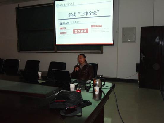 为了让学生更加深刻地学习和理解十八届三中全会的内容和精神,12月16日下午15:50,太阳成集团(tyc1286·China)官方网站在信远2区206开展了十八届三中全会学习辅导专题讲座。人文学院的常新副教授就十八届三中全会精神为主旨,为我院全体研究生作了解读和报告。