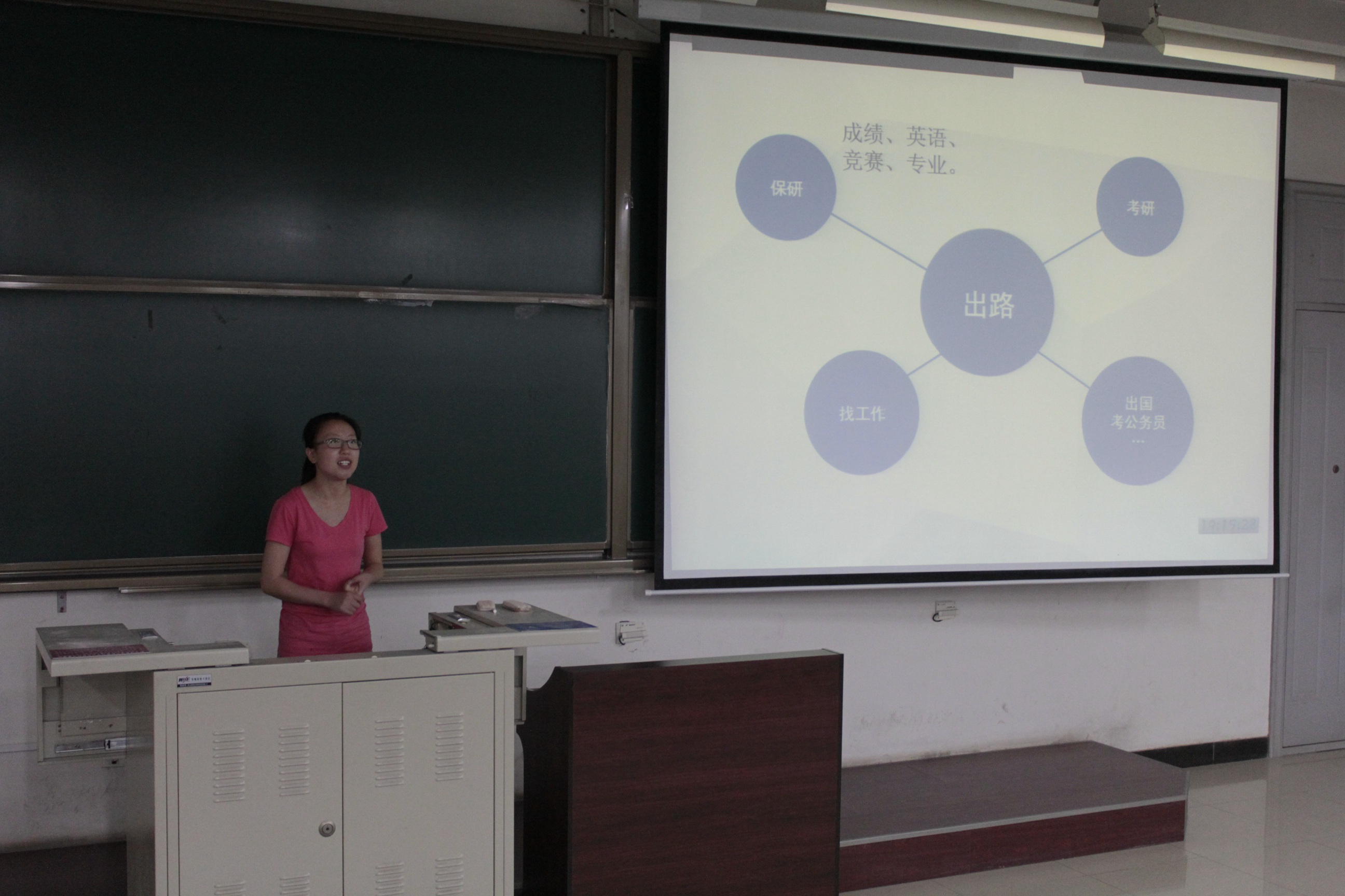 首先是陈香学姐发言,她主要向同学们分享了一些保研经验,对保研政策进行了讲解与答疑,并向同学们介绍了她的大学四年清单。接着是王可圆学姐跟大家分享考研经验,她指出了一些考研时的注意事项,并向同学们介绍了她本人的考研安排与计划,强调大家应当养成良好的作息习惯,善用时间。最后是孙铁阳学长给同学们做了留学申请经验交流,他主要对何时开始做留学的准备以及留学申请的注意事项做出了介绍。