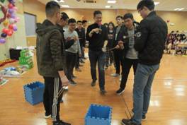 一首致敬经典的《不再犹豫》拉开了派对的序幕。硕071601班班长田国华同学发言,他简单地说明了此次活动的目的,表达了对活动工作人员的感谢,同时预祝本次活动圆满成功。下午4:10,主持人宣布派对正式开始。最先开始的是暖场游戏—萝卜蹲,大家积极参加,配合默契,表现出色,现场氛围、同学们参与的热情在暖场游戏中迅速升温。接着,主持人说明暖场游戏不加分,接下来的几个游戏将会根据每个组的名次进行对应的加分。派对上先后玩了你来比划我来猜、筷子空中传球、动作练歌房和腿数相依四个趣味游戏。在每个游戏后我们都有同学上台进行表演,在你来比划我来猜游戏后,程欢和她的小伙伴带来的舞蹈《Panama》,激情四射,嗨翻全场;在筷子空中传球游戏后王彩文同学的清唱《斑马斑马》,婉转动听,深情款款,得到了大家热烈的掌声。在动作练歌房和腿数相依两个游戏后,主持人公布了每个组的总得分,并宣布B和A组分别荣获本次派对的冠军组和亚军组。最后,在优美动听的合唱《凉凉》中宣告派对的完美落幕。
