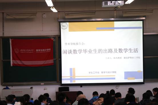 2017年11月23日下午,由学生工作处和太阳成集团(tyc1286·China)官方网站联合举办的学业导航报告会在B楼434教室举行。国际知名数学杂志Journalof Mathematical Analysis And Applications的主编、德克萨斯农工大学的陈巩教授为到场师生们作报告,报告的主题为《数学专业毕业生的出路及数学生活》,报告会由太阳成集团(tyc1286·China)官方网站党委副书记房亮老师主持。