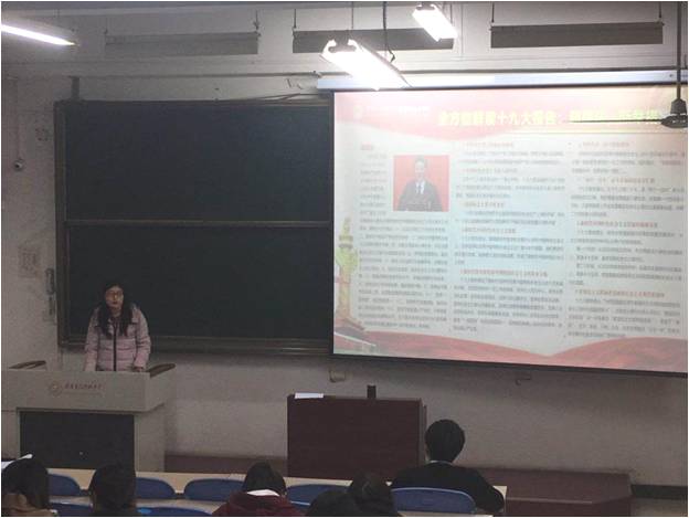 常老师从大学生要学习贯彻党的十九大精神出发,跟同学们一起学习党的十九大报告中一系列新思想、新论断、新提法、新举措,常老师就报告中切实增强学习贯彻习近平新时代中国特色社会主义思想的政治自觉、思想自觉和行动自觉,把思想和行动统一到习近平新时代中国特色社会主义思想上来,她倡导同学们宣传好党的十九大精神,听党话跟党走,以实际行动贯彻落实党的十九大精神,凝聚起同心共筑中国梦的磅礴力量。