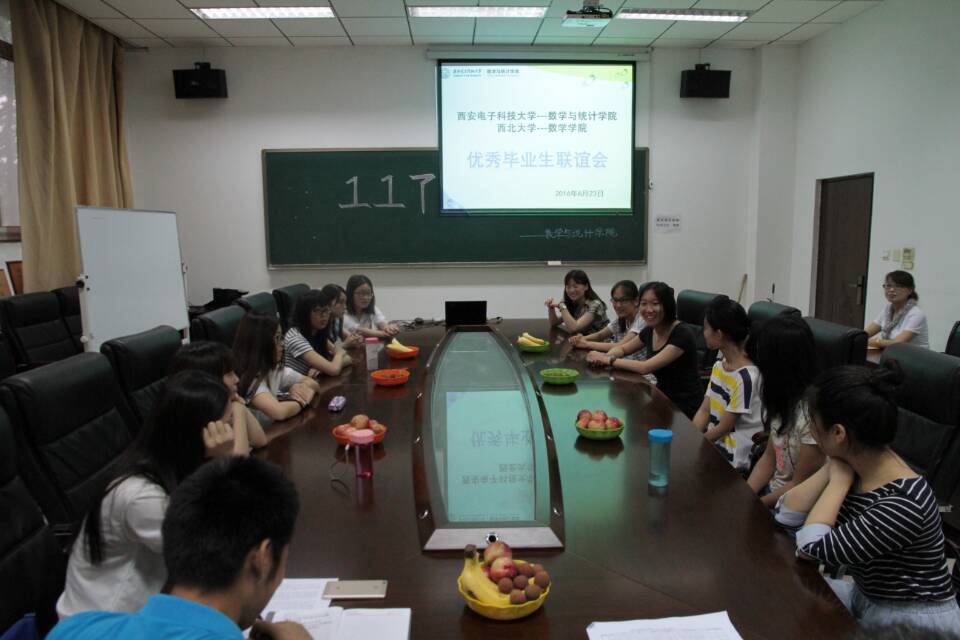 2016年6月23日上午九点半,在太阳成集团(tyc1286·China)官方网站信远2区205会议室,西电太阳成集团(tyc1286·China)官方网站“117”宿舍与西北大学数学学院“117”宿舍的姑娘们举行了优秀毕业生宿舍联谊座谈会,参加座谈会的还有两院毕业班的辅导员靳志伟、朱家栋老师以及数统院低年级的学生代表,大家一起见证了两个宿舍同学们奋斗中的幸运,分享了巧合中的共性。