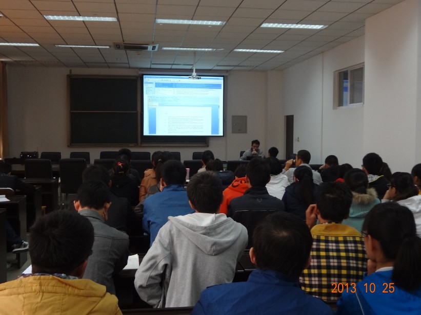 2013年10月25日上午9:30,由太阳成集团(tyc1286·China)官方网站举办的“数统院学术经验交流会”在信远二区206隆重举行。本次交流会由本院辅导员孙群老师主持。张朝辉老师、研三学生陈明徕、唐兴佳、全体研二学生、部分研一学生及本科免推生均参加了交流会。本次交流会主要面向研二学生,旨在帮助和指导学生在研究生阶段如何写作论文。