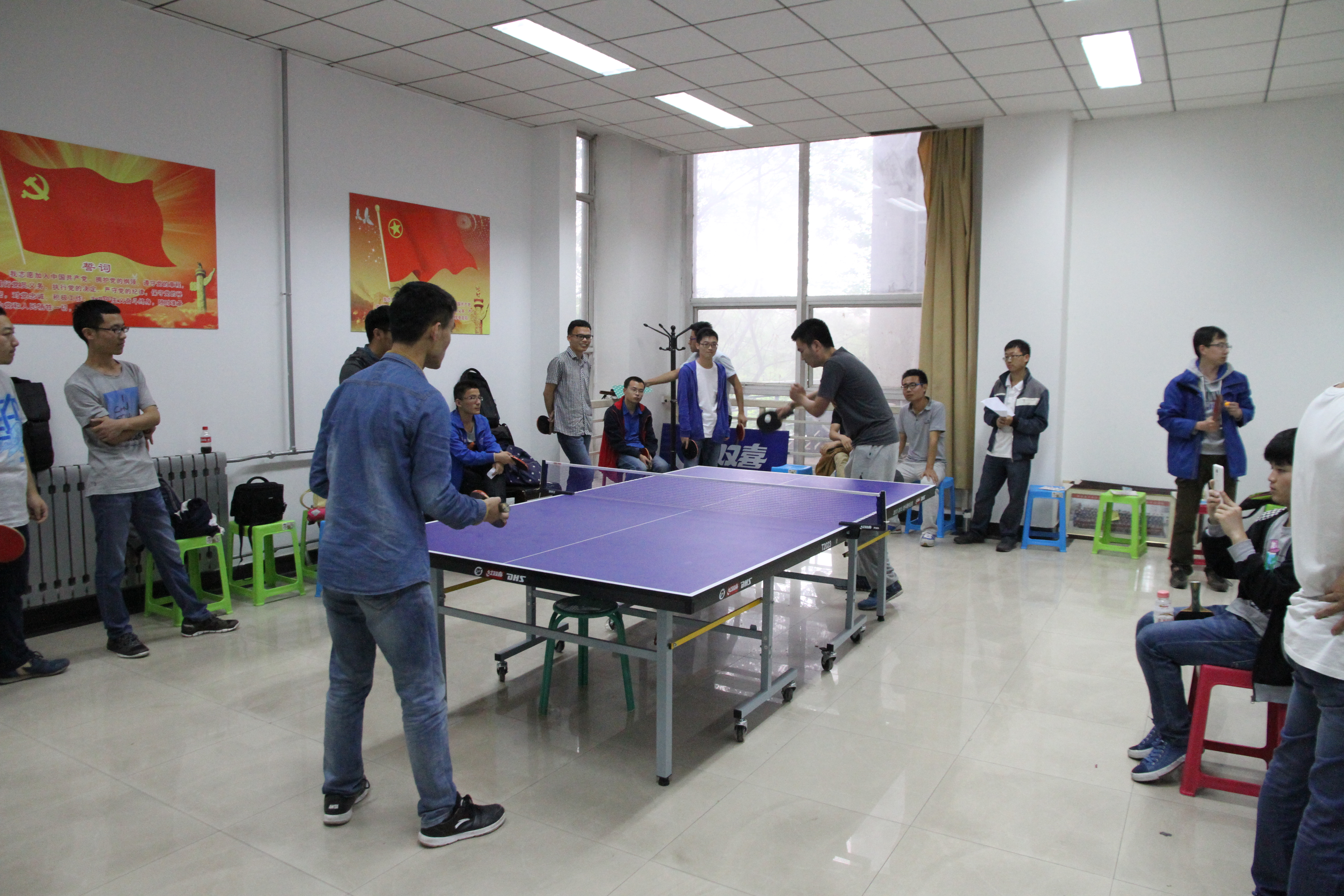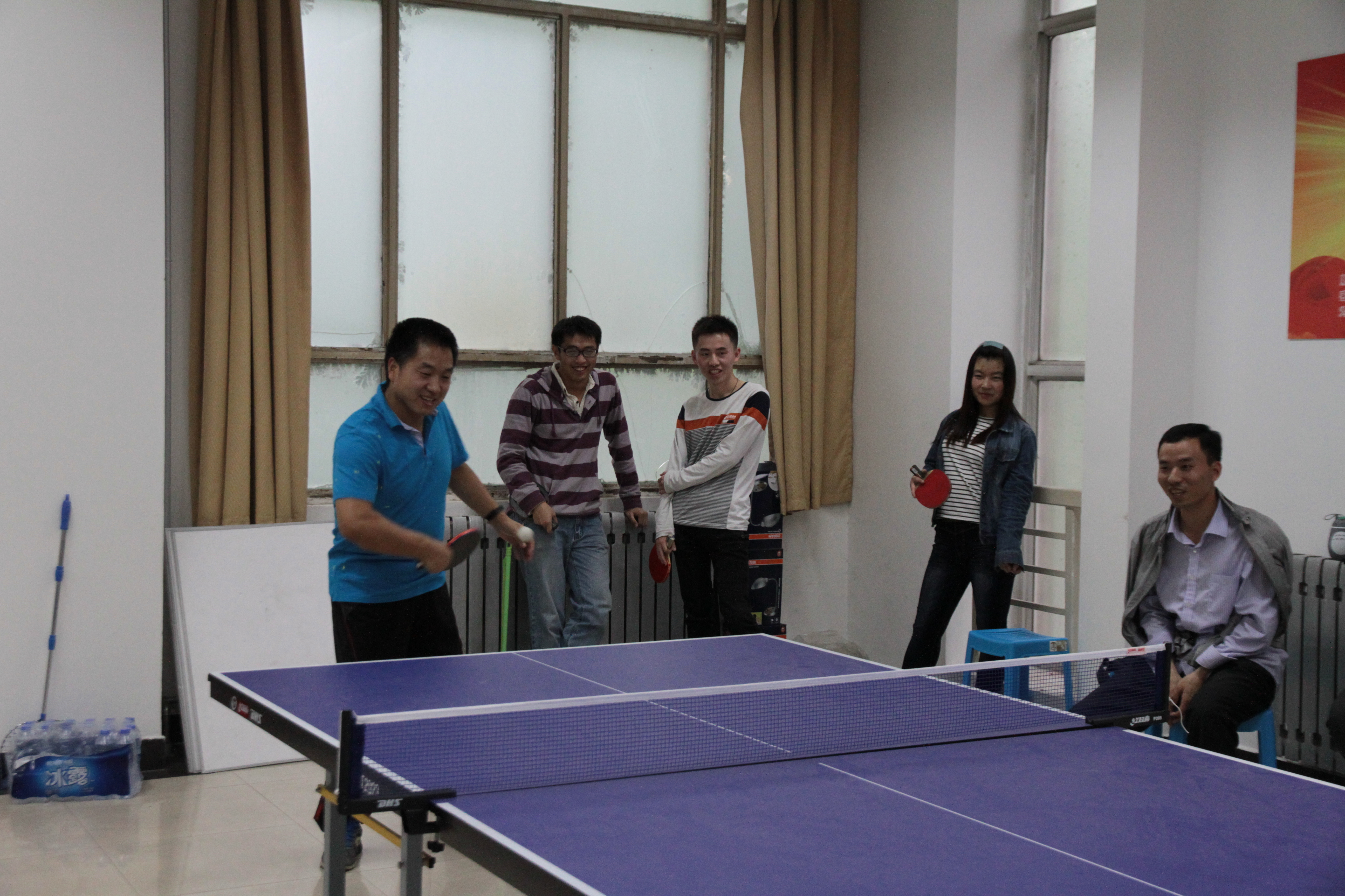 5月14日下午两点比赛正式开幕,恶劣的天气并没有挡住大家运动的心,每位参赛选手都用饱满的热情的参加了比赛。比赛以男单、女单、男双、女双、混双赛制采取抽签式进行,分成A,B两组。在主持人宣读完比赛规则后,紧张的比赛就正式开始了。首先进行的是各个小组赛的男单,男同胞们每个人都集中精神,奋力拼搏,展示了他们精湛娴熟的技巧;女同胞们也毫不逊色,一个个都身怀绝技,实力超强;在双打比赛中,老师与学生们打成一片,在这一刻,没有师生,只有队友和对手,师生间的氛围温暖融洽又紧张激烈,现场观众不时为选手们一个个绝妙的防守和扣杀而欢呼,更是将现场的氛围带动得活泼热烈,最终第二小队以微弱的优势赢得了第一。在经历了激烈而又精彩的比赛之后,研究生会为参赛选手颁发了奖状和奖品并合影留念。