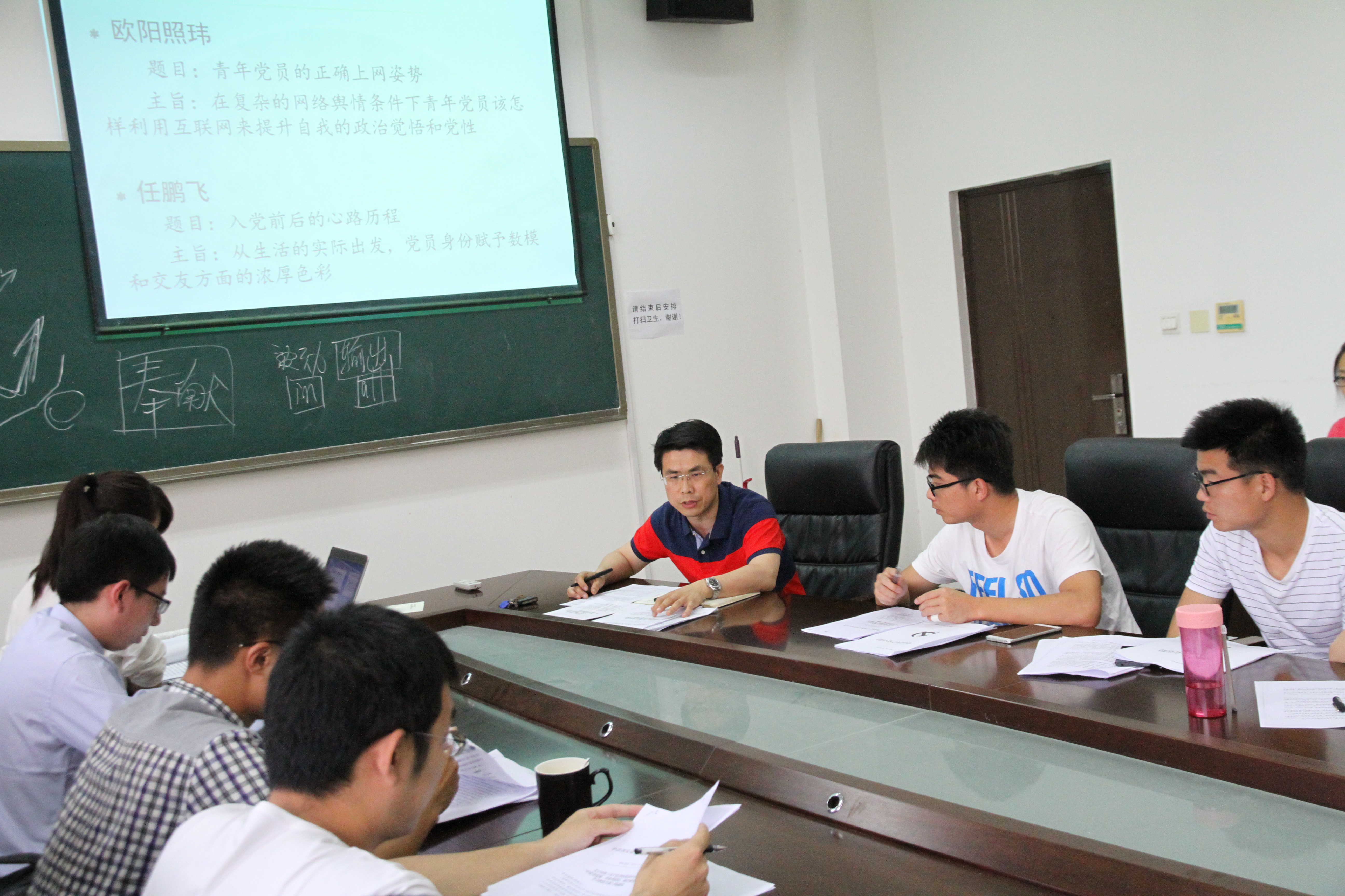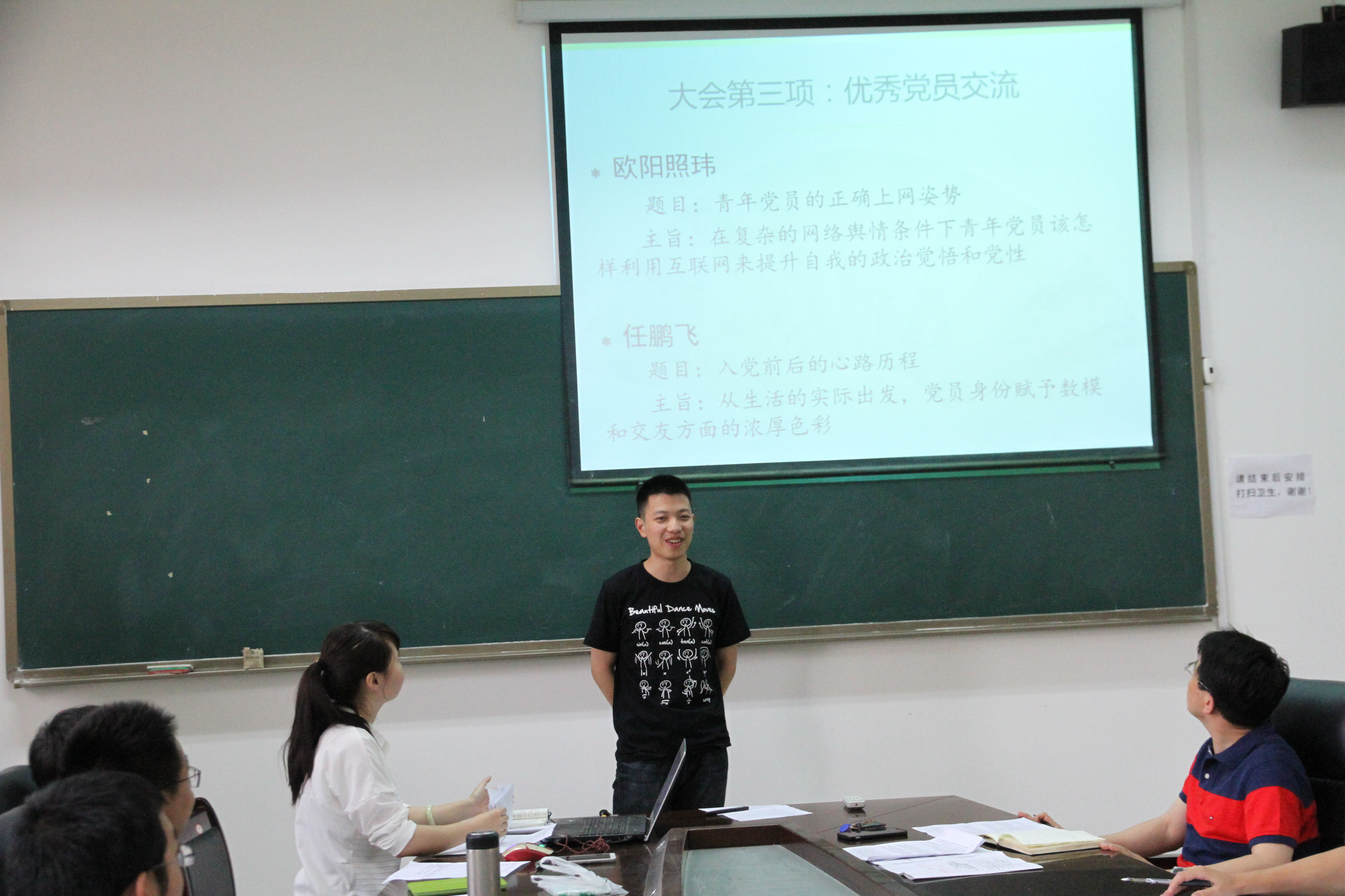 然后欧阳照玮同学就复杂的网络舆情条件下青年党员该怎样利用互联网来提升自我政治觉悟和党性为主旨,向支部党员同志推荐了几个了解官方政治新闻的平台,并指出发挥党员的先进性、引导正确的网络价值观是新时期下我们青年党员的历史使命。任鹏飞同学从生活实际出发,结合自己指导数学建模队伍获奖的经历,从切实发挥党员模范先锋作用方面,讲述了自己入党前后的心路历程,鼓励大家将党员的党性修养融入到学习生活的方方面面。