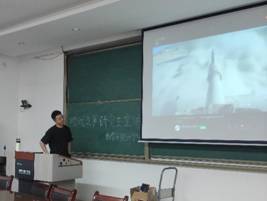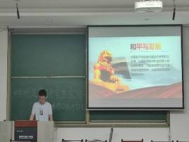 第四位宣讲人王金跃围绕“军事强国”进行宣讲,他以中国兵器工业集团的一个气势磅礴的宣传片为开端,以近年来的国际形势和中国近代史为例,详细剖析了军事强国的必要性并抒发了自己科研报国的远大理想。纵观中华民族发展历史,所有雄视万方,彪炳史册的强盛时期的共同点就是经济发达,军事强大,而鸦片战争以来的现实和历史反复表明,没有一个巩固的国防和强大的军队,强国梦就难以实现,所以实现强国梦,必须先强军。只有拥有强大军事力量才能为我国的和平发展提供有力保障,只有实现“强国梦、强军梦”才能维护国家领空领海领域不受侵犯、保障经济全球化中国权益的拓展,国家利益不受侵犯。最后,王金跃深情表示:“我进入了军工单位,像神秘人一样在背后为国家的发展贡献自己的微薄力量。我将为此奋斗终身,忠贞不渝。虽然工作区域远在边疆,但是我内心告诉我,那将是我一辈子追寻的梦。”
