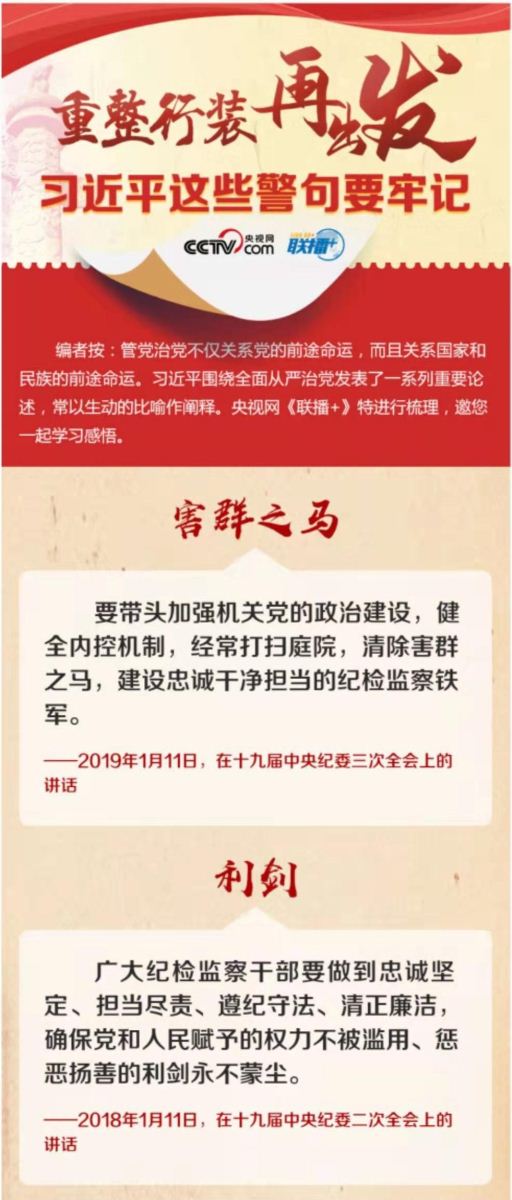 党的十九大以来,习近平总书记在众多场合对推动全面从严治党向纵深发展提出明确要求,字字铿锵有力、句句掷地有声。央视网《联播+》特梳理总书记治党话语,邀您一起学习感悟。