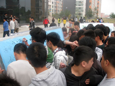 活动中很多同学积极踊跃的在签名板上签名,对本次活动表现出极大热情。我们真诚地希望此次活动可以有更好的成效,同学们能够自觉遵守校规校纪,文明自己的言行,塑造大学生的良好形象,共同营造和谐校园环境。