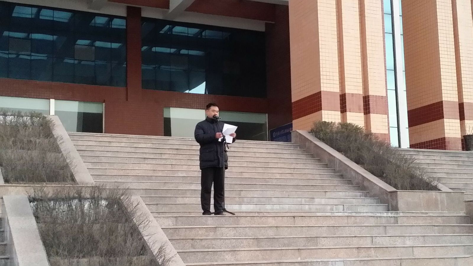 升旗仪式结束后,我院学生处处长王睿发表了讲话。讲话中,他带领全体师生回顾了2015年党和国家、学院发生的重大事件,鼓励同学们珍惜时光,抓住机遇,积极进取、努力拼搏,以最佳的状态投入新一年的学习生活中。在讲话的第二部分,王睿把我院期末的各项工作向师生们一一做了介绍,并突出强调了期末复习、诚信考试以及假期安全注意事项。