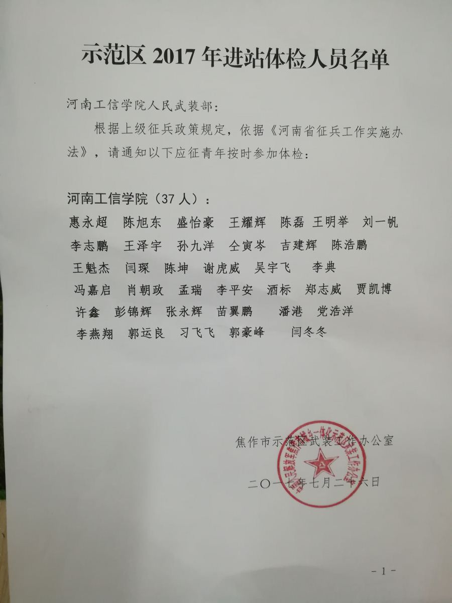 现对我院2017年参军进站体检人员进行公示,公示期5天,名单如下: