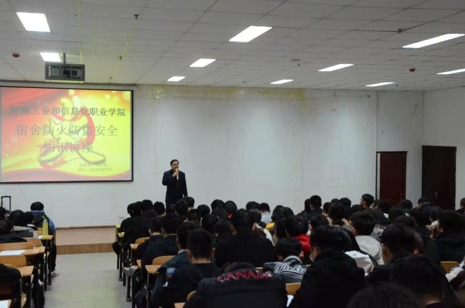 为进一步提高学生安全意识,营造文明、安全、舒适的宿舍生活环境,11月20日,宿舍管理办公室在信息楼第四会议室举办了以“宿舍防火防盗安全知识”为主题的安全知识讲座。讲座由宿管办副主任黄绍东老师主讲,各系部辅导员以及学生代表200多人参加了本次讲座。