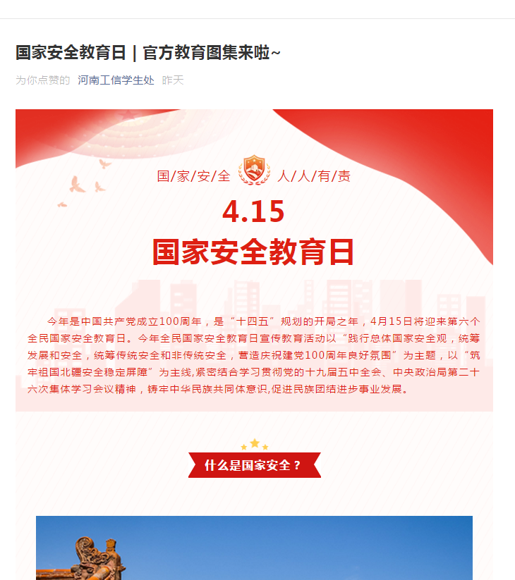 近年来,学校把国家安全教育作为意识形态领域的一项重要内容,持续强化宣传教育。4月15日当天,学校通过官微、“河南工信学生处”公众号,转载推送“中国普法网”等主流媒体关于“全民国家安全教育日”的学习内容。期间,各系部组织召开了“全民国家安全教育日”主题班会,同期组织交流研讨,重点围绕“全民国家安全教育日”的由来、意义,以及《中华人民共和国国家安全法》《中华人民共和国网络安全法》《国家保密法》《中华人民共和国反间谍法》《反分裂国家法》《中华人民共和国反恐怖主义法》和《中华人民共和国野生动物保护法》《中华人民共和国传染病防治法》《中华人民共和国国境卫生检疫法》等法律法规开展学习。