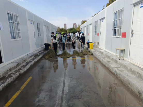 2021年11月7日,根据院领导的指示,学生处丁军猛处长带领工作人员及学生干部到校内疫情防控集中隔离点进行慰问,组织志愿者打扫隔离点的卫生,并为隔离学生带去被子、热水等生活用品。