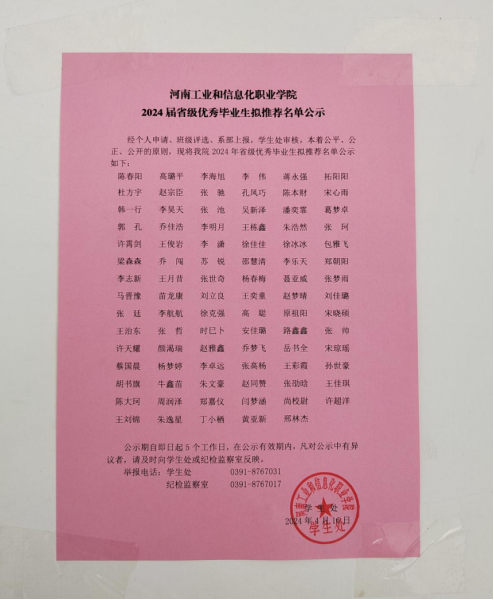 根据《河南省教育厅办公室关于评选2024年河南省普通大中专学校优秀应届毕业生的通知》文件要求,我校开展了2024年优秀应届毕业生评选工作。经个人申请、班级评选、系部上报,学生处审核,本着公平、公正、公开的原则,现已将拟推荐名单公示在二组团教学楼处,同时请各系部在本系部范围内进行公示。