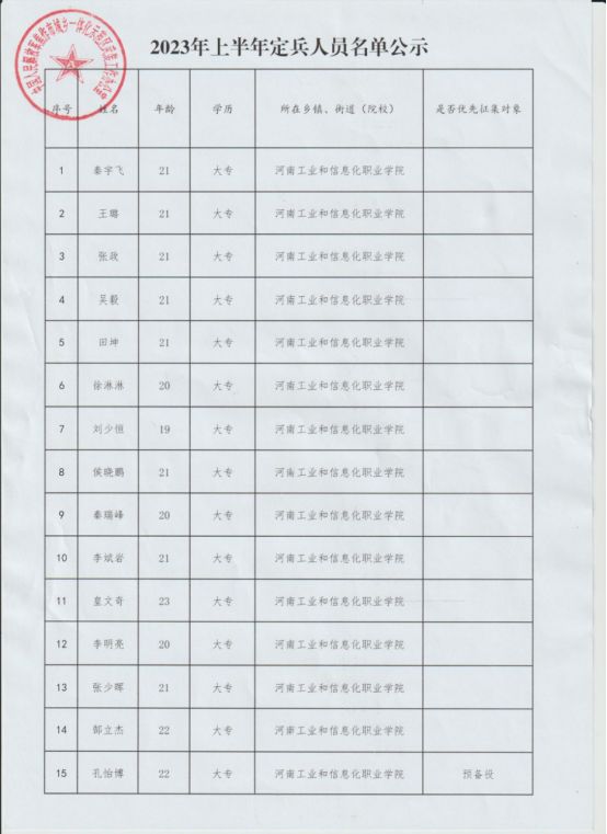经初检初审、体检、心理测试、政审考核、役前训练等环节,高新示范区征兵领导小组组织区征兵办、基层武装部和学校武装部集体研究,确定我校秦宇飞等31名同学为定兵对象,现根据相关规定予以公示,人员名单如下: