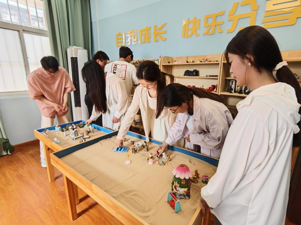 在心理沙盘室,同学们在沙具架上自由选取沙具,在沙箱中摆放沙具构建心灵世界,通过作品表达内心,心理老师提供解读和指导。