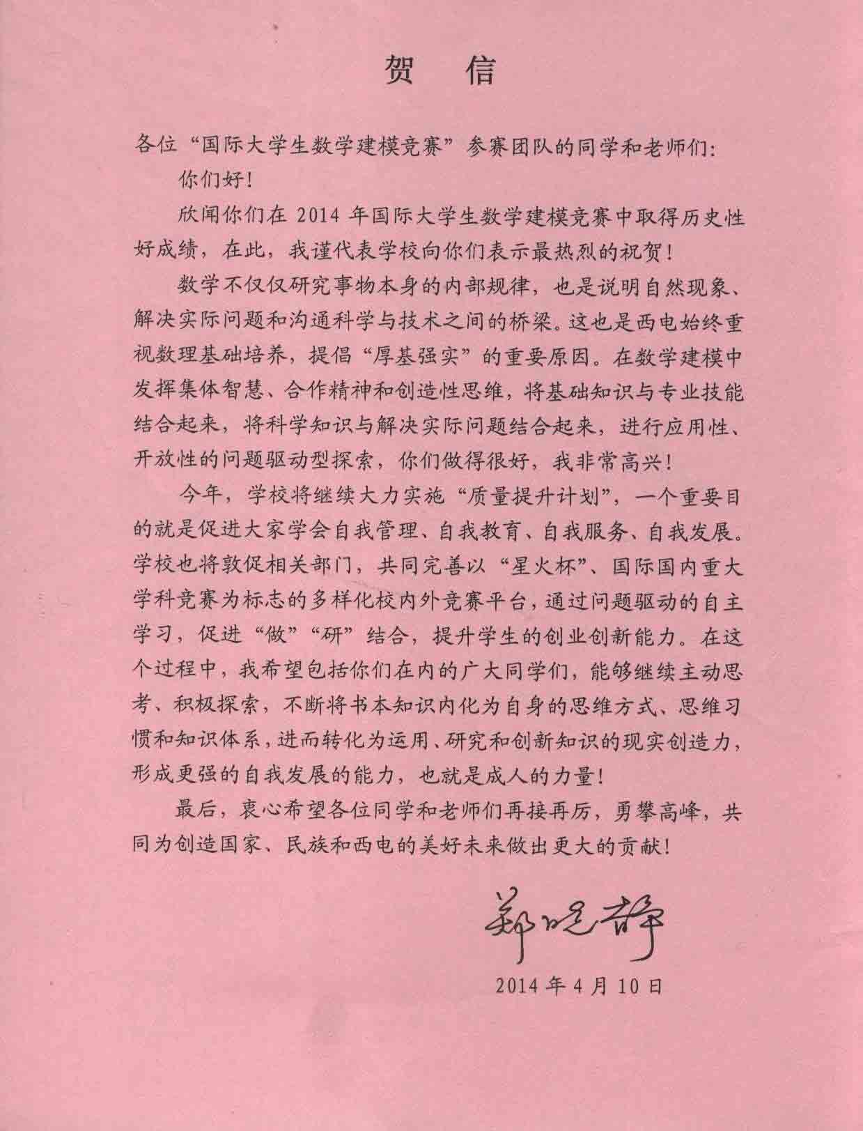 近日,从国际大学生数学建模竞赛官方网站获知,在由美国主办的2014年国际大学生数学建模竞赛中,西安电子科技大学获得特等奖(OUTSTANDING)1项,一等奖(Meritorious)7项,二等奖(Honorable Mention)17项。