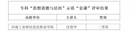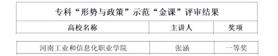 近日,河南省教育厅公示了高校思政课优秀课程资源评审结果,我校推荐的2门思政课入选优秀课程。在示范“金课”评选中,张可之获特等奖,张涵、杨真珍分别获得一等奖,任艳华获得二等奖。