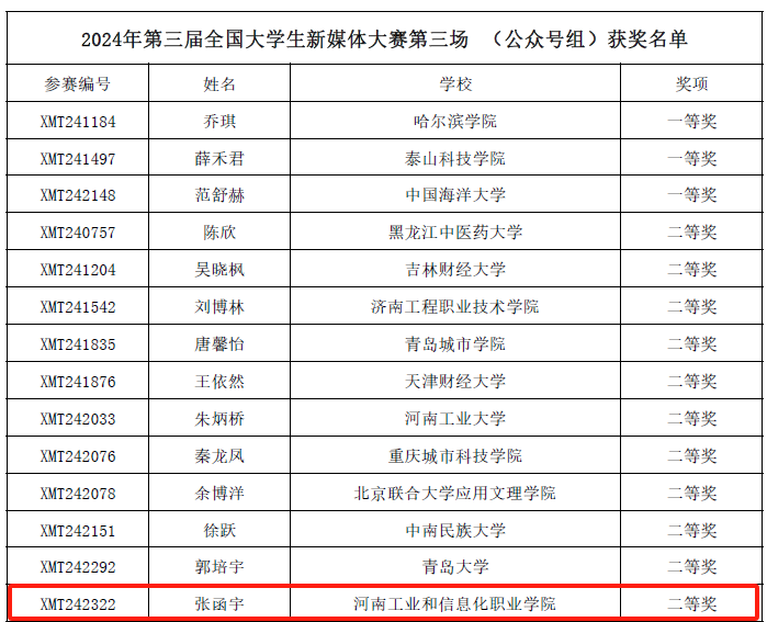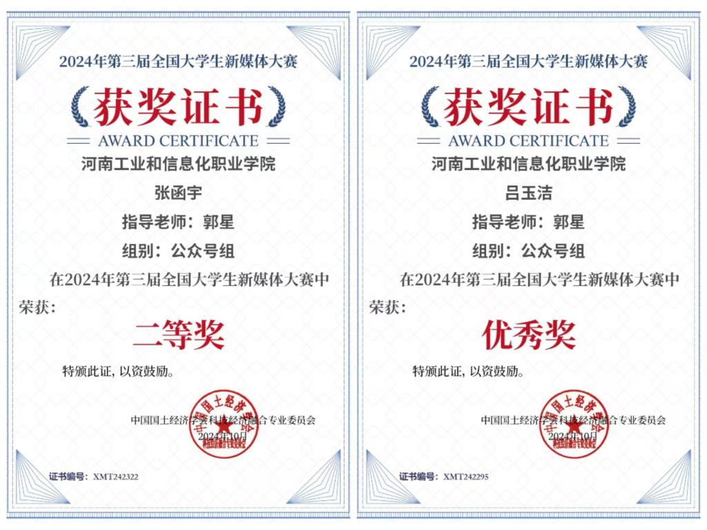 近日,2024年第三届全国大学生新媒体大赛圆满落幕,我校学生在本次大赛中脱颖而出,取得了优异成绩。其中,数字媒体23-2班张函宇同学荣获公众号组比赛二等奖,数字媒体23-1班吕玉洁同学荣获优秀奖。