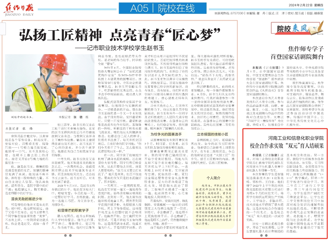 《焦作日报2024-2-22》报道我校校企合作建设情况