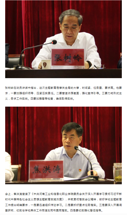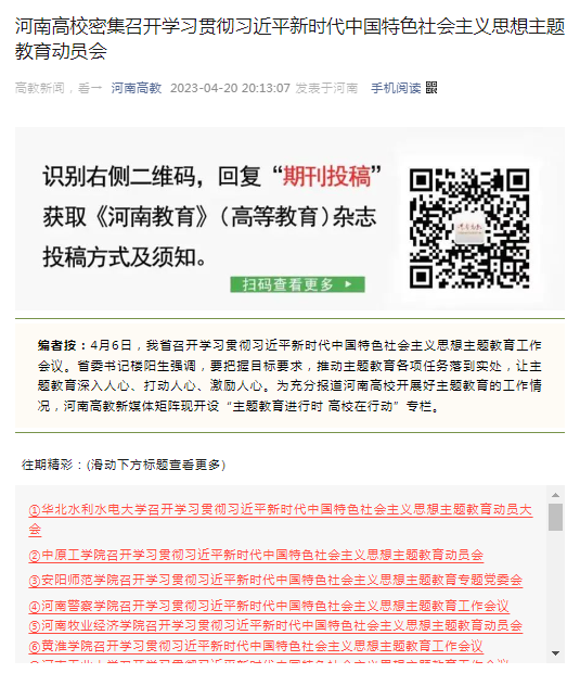 《河南高校2023-4-20》报道我校学习贯彻习近平新时代中国特色社会主义思想主题教育动员会