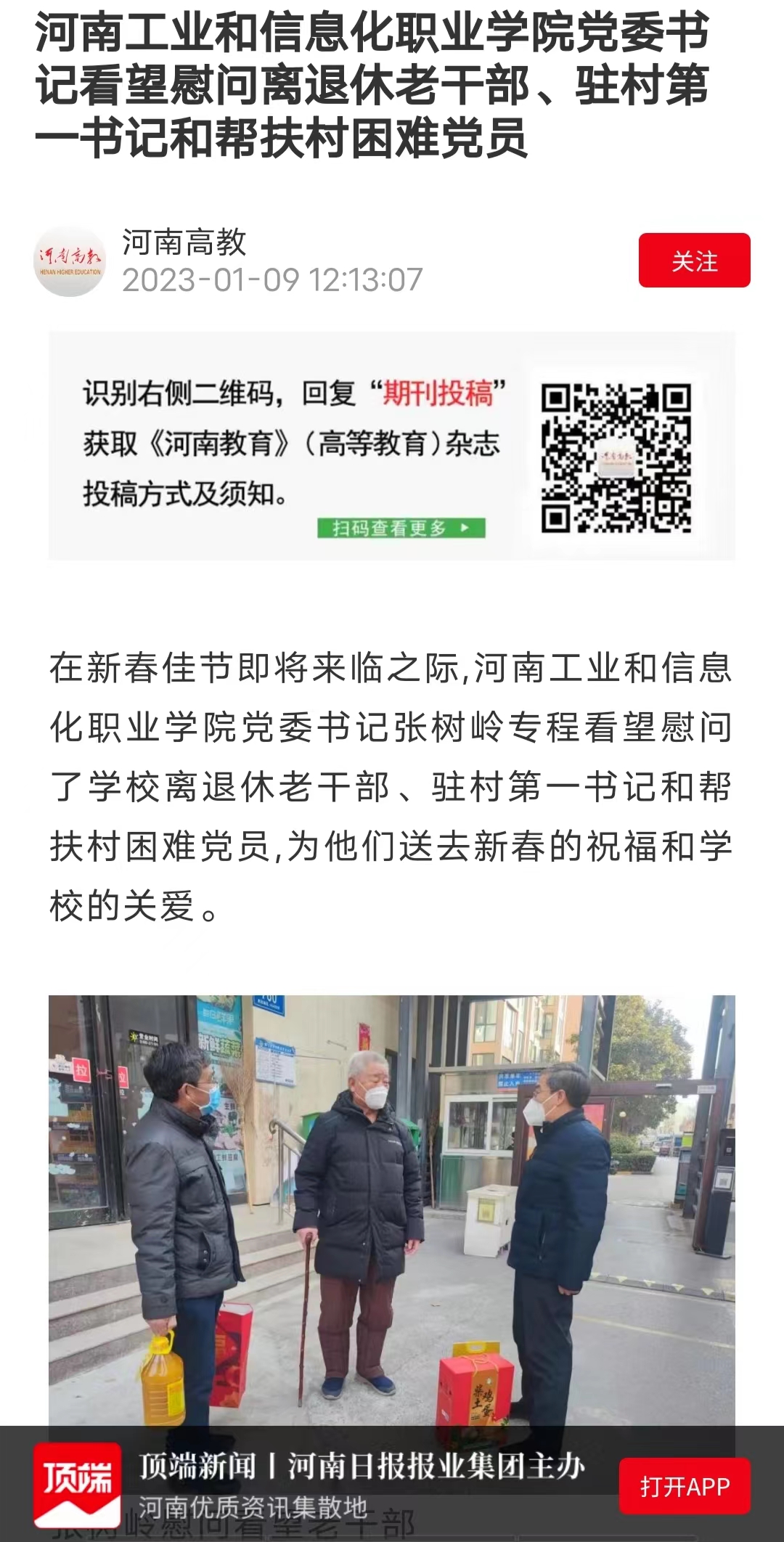 《顶端新闻2023-1-9》转发“河南高教” 报道我校党委书记看望慰问离退休老干部、驻村第一书记和帮扶村困难党员