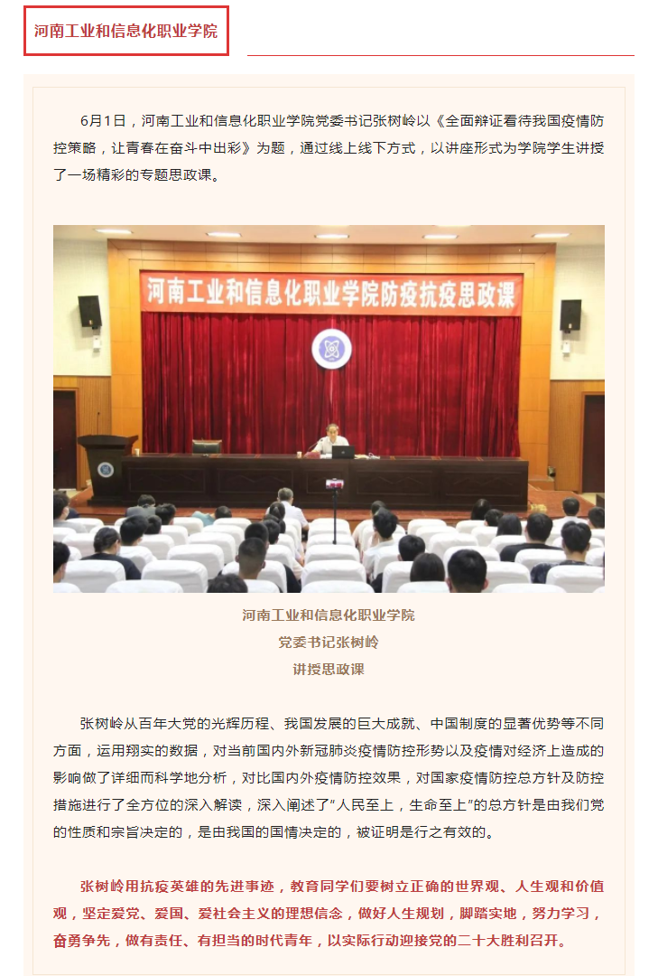 《豫教思语2022-06-06》报道我院党委书记张树岭为学生讲授防疫抗疫思政课