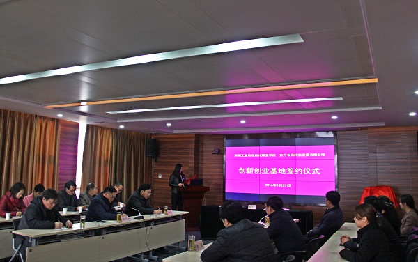 为积极响应李克强总理“大众创业、万众创新”的号召,扎实推进大学青年学生创新创业教育与实践活动,日前,我院与焦作东方今典科技发展有限公司校企共建大学生创新创业基地签约暨人才培养基地揭牌仪式在焦作科技总部新城创客空间隆重举行。焦作市城乡一体化示范区招商局局长高鸿,焦作科技总部新城项目总经理贾建军、副总经理涂哲,学院领导毋虎城、邱雨生出席揭牌仪式。