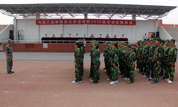 9月17日下午,我院2015级新生军训会操表演在田径运动场举行。院领导王海长、陈荣邦、席振修、邱雨生、学院相关处室和各系负责人、承训部队带队教官等观看了会操表演,并为受表彰的军训优秀教官和学生先进个人颁奖。王海长代表学院向承训部队赠送了锦旗。