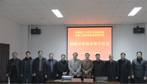 1月7日下午,我院与河南理工大学万方科技学院在第三会议室举行“战略合作协议”签字仪式。万方科技学院院长王裕清、党委书记王建中、常务副院长郑伦仁、党委副书记杨玉海及党政办公室副主任王建军、教务处处长邓乐、能源系主任王永建、党政办公室秘书科科长马艳,学院领导翟贵平、王海长、毋虎城、陈荣邦、席振修、邱雨生、吕况及全体中层干部参加了签字仪式。仪式由王海长主持。