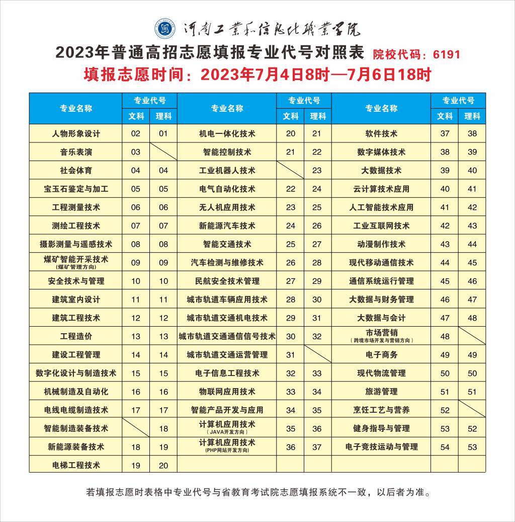 河南工业和信息化职业学院2023年普通高招志愿填报专业代号对照表